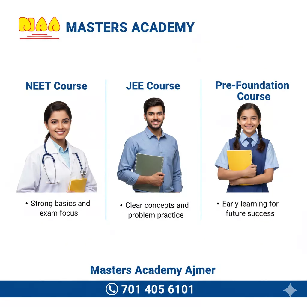 Masters Academy Ajmer is a trusted coaching institute for NEET, IIT-JEE, and Pre-Foundation courses in Ajmer. We help students learn step by step, so every topic becomes clear and easy to understand. Our goal is to build strong basics in Science and Maths and guide students toward success with care and focus.